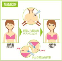 手術は通常の脂肪吸引と同様に極細の管(カニューレ)を使用し、注入に使用する脂肪を確保することから始めます。 吸引した脂肪を生理食塩水で洗浄し、状態の良い、注入に適した脂肪のみを選別した後、注射器に移し替え、バストの筋肉層・乳腺層・脂肪層などに少しずつ丁寧に注入して形を整えていきます。 ![]() ![]() ![]() 関連サイトのご案内